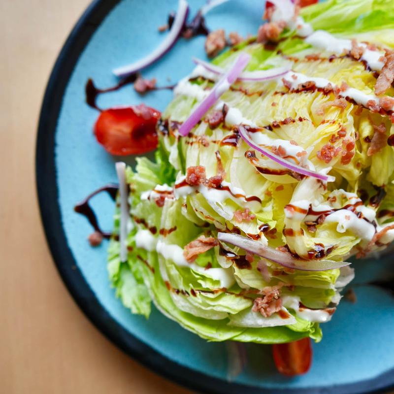 Fresh lettuce wedge with bacon, red onions, tomatoes, blue cheese, with balsalmic drizzle