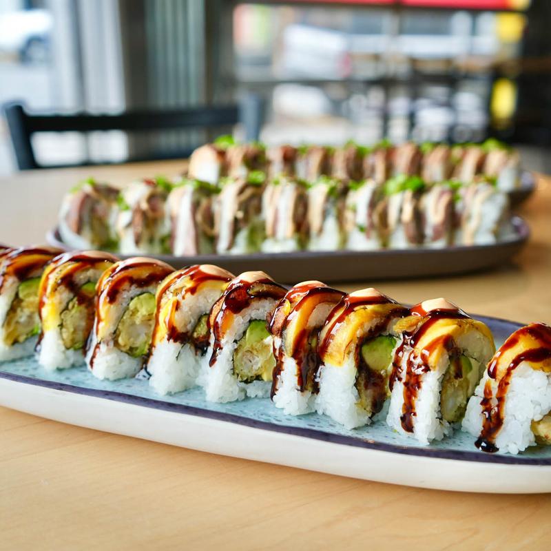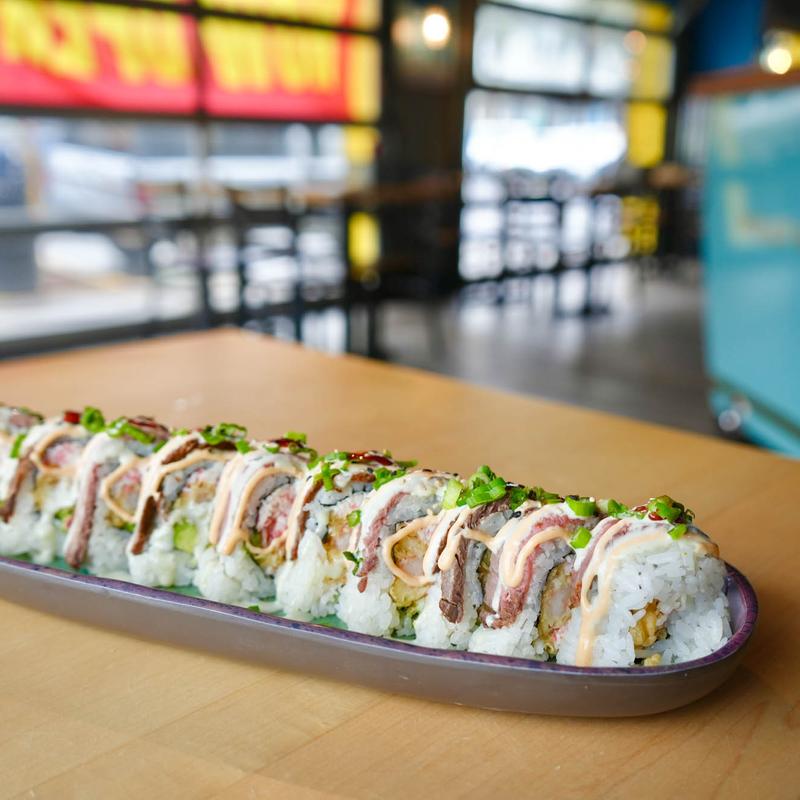 Spicy salmon, avocado, and cucumber, topped with yellowfin tuna, yellowtail, wasabi sauce, smelt roe, and green onions