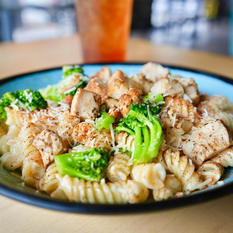 Blackened chicken breast, served over tender rotini pasta with crisp steamed broccoli, all tossed in rich, velvety alfredo sauce